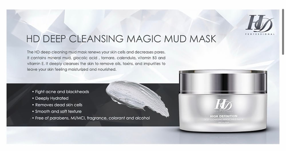 The HD deep cleaning mud mask renews your skin cells and decreases pore size. It contains mineral mud, glycolic acid, tornare, calendula, vitamin B3 and vitamin E. It deeply cleanses the skin to remove oils, toxins, and impurities to leave your skin feeling moisturised and nourished.